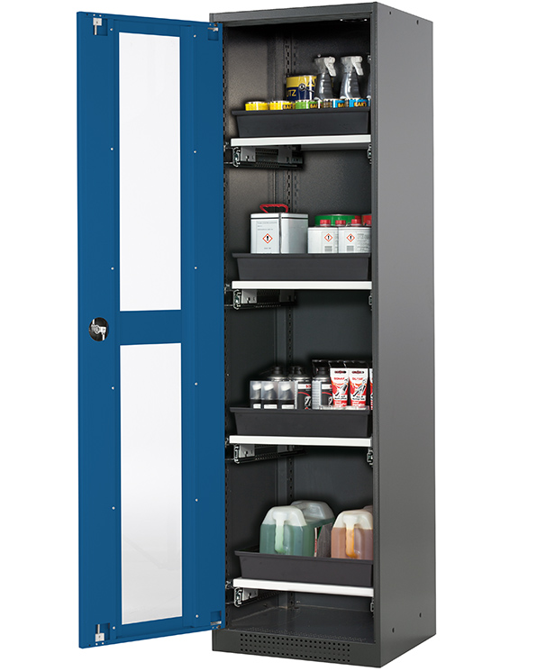 color del cuerpo gris antracita (RAL 7016), con puerta batiente con ventanas fijas en azul genciana (RAL 5010), equipamiento interior con 4 x cajón extraíble (plancha de acero/PP recubrimiento plástico)
