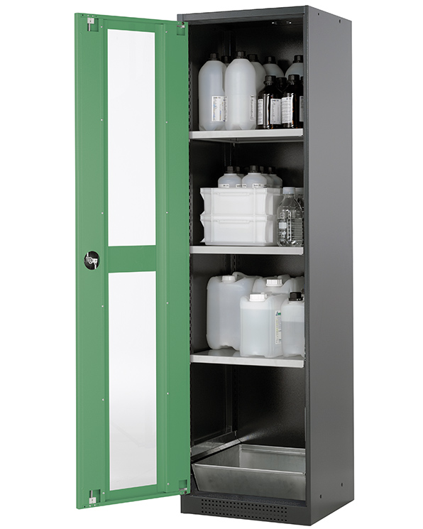 color del cuerpo gris antracita (RAL 7016), con puerta batiente con ventanas fijas en verde reseda (RAL 6011), equipamiento interior con 3 x bandeja, 1 x cubeto de retención (plancha de acero recubrimiento galvanizado)