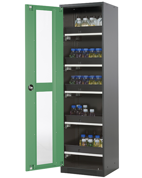 color del cuerpo gris antracita (RAL 7016), con puerta batiente con ventanas fijas en verde reseda (RAL 6011), equipamiento interior con 5 x cajón extraíble (plancha de acero/PP recubrimiento plástico)