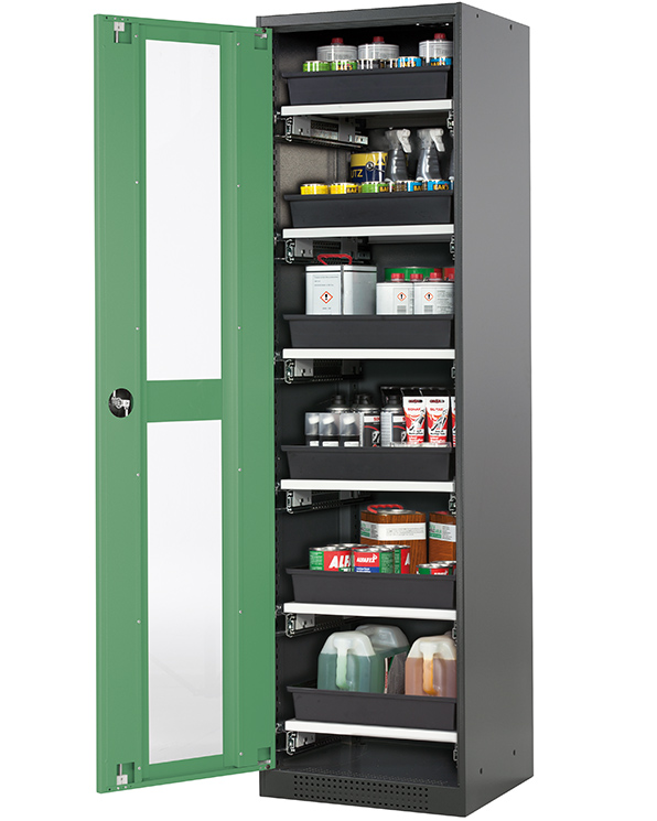 color del cuerpo gris antracita (RAL 7016), con puerta batiente con ventanas fijas en verde reseda (RAL 6011), equipamiento interior con 6 x cajón extraíble (plancha de acero/PP recubrimiento plástico)