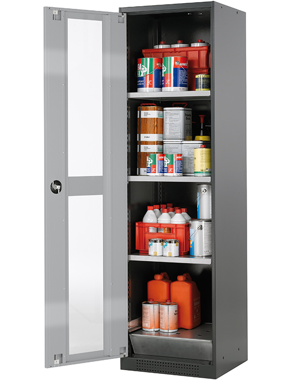 color del cuerpo gris antracita (RAL 7016), con puerta batiente con ventanas fijas en asecos plata, equipamiento interior con 3 x bandeja, 1 x bandeja perforada, 1 x cubeto de retención (plancha de acero recubrimiento galvanizado)