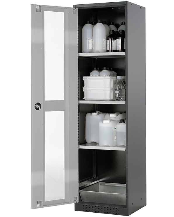 color del cuerpo gris antracita (RAL 7016), con puerta batiente con ventanas fijas en asecos plata, equipamiento interior con 3 x bandeja, 1 x cubeto de retención (plancha de acero recubrimiento galvanizado)