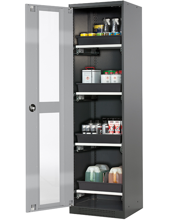 color del cuerpo gris antracita (RAL 7016), con puerta batiente con ventanas fijas en asecos plata, equipamiento interior con 4 x cajón extraíble (plancha de acero/PP recubrimiento plástico)
