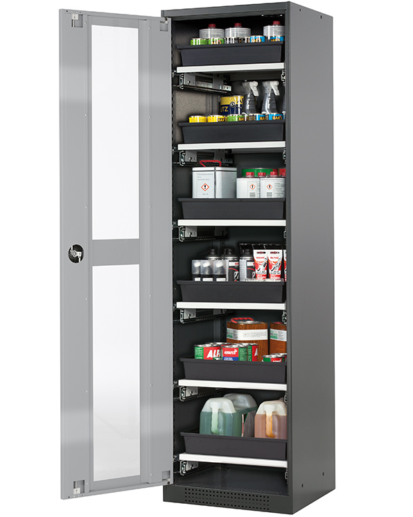 color del cuerpo gris antracita (RAL 7016), con puerta batiente con ventanas fijas en asecos plata, equipamiento interior con 6 x cajón extraíble (plancha de acero/PP recubrimiento plástico)