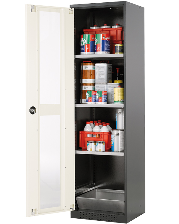 color del cuerpo gris antracita (RAL 7016), con puerta batiente con ventanas fijas en blanco puro (RAL 9010), equipamiento interior con 3 x bandeja, 1 x cubeto de retención (plancha de acero recubrimiento galvanizado)