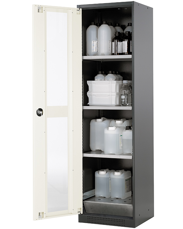 color del cuerpo gris antracita (RAL 7016), con puerta batiente con ventanas fijas en blanco puro (RAL 9010), equipamiento interior con 3 x bandeja, 1 x bandeja perforada, 1 x cubeto de retención (plancha de acero recubrimiento galvanizado)