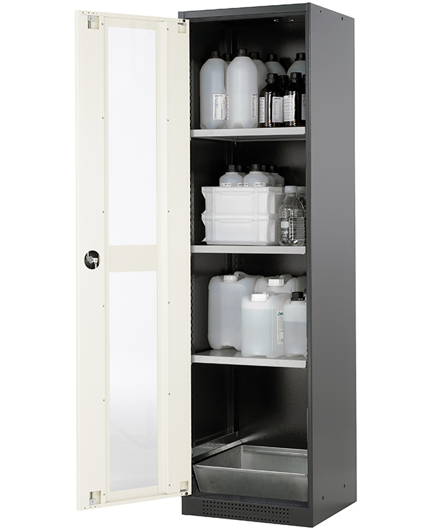color del cuerpo gris antracita (RAL 7016), con puerta batiente con ventanas fijas en blanco puro (RAL 9010), equipamiento interior con 3 x bandeja, 1 x cubeto de retención (plancha de acero recubrimiento galvanizado)