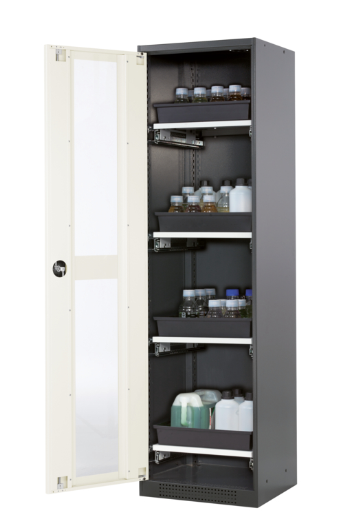 color del cuerpo gris antracita (RAL 7016), con puerta batiente con ventanas fijas en blanco puro (RAL 9010), equipamiento interior con 4 x cajón extraíble (plancha de acero/PP recubrimiento plástico)