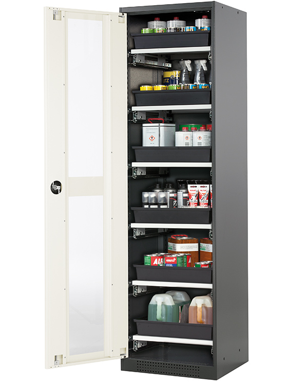 color del cuerpo gris antracita (RAL 7016), con puerta batiente con ventanas fijas en blanco puro (RAL 9010), equipamiento interior con 6 x cajón extraíble (plancha de acero/PP recubrimiento plástico)