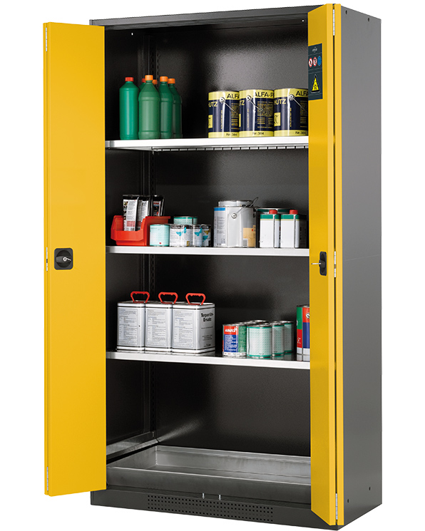 color del cuerpo gris antracita (RAL 7016), con puertas plegables en amarillo seguridad (RAL 1004), equipamiento interior con 3 x bandeja, 1 x cubeto de retención (plancha de acero recubrimiento galvanizado)