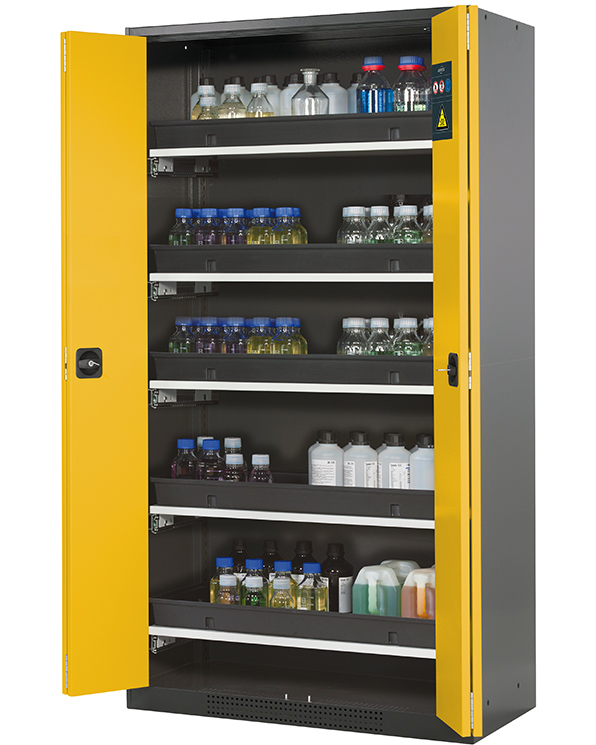 color del cuerpo gris antracita (RAL 7016), con puertas plegables en amarillo seguridad (RAL 1004), equipamiento interior con 5 x cajón extraíble (plancha de acero/PP recubrimiento plástico)