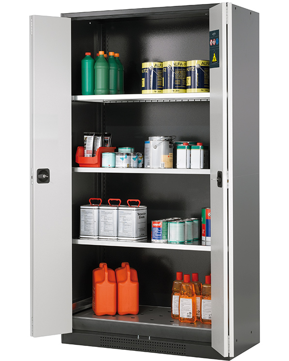 color del cuerpo gris antracita (RAL 7016), con puertas plegables en gris claro (RAL 7035), equipamiento interior con 3 x bandeja, 1 x bandeja perforada, 1 x cubeto de retención (plancha de acero recubrimiento galvanizado)