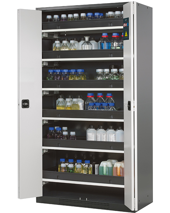 color del cuerpo gris antracita (RAL 7016), con puertas plegables en gris claro (RAL 7035), equipamiento interior con 6 x cajón extraíble (plancha de acero/PP recubrimiento plástico)