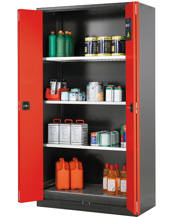 color del cuerpo gris antracita (RAL 7016), con puertas plegables en rojo tráfico (RAL 3020), equipamiento interior con 3 x bandeja, 1 x bandeja perforada, 1 x cubeto de retención (plancha de acero recubrimiento galvanizado)