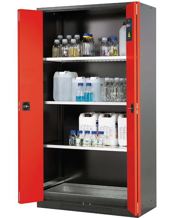 color del cuerpo gris antracita (RAL 7016), con puertas plegables en rojo tráfico (RAL 3020), equipamiento interior con 3 x bandeja, 1 x cubeto de retención (plancha de acero recubrimiento galvanizado)