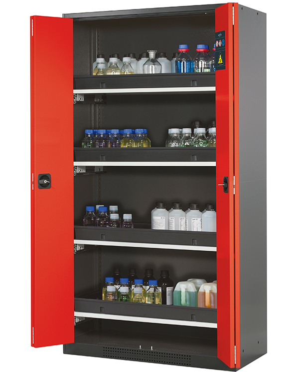 color del cuerpo gris antracita (RAL 7016), con puertas plegables en rojo tráfico (RAL 3020), equipamiento interior con 4 x cajón extraíble (plancha de acero/PP recubrimiento plástico)