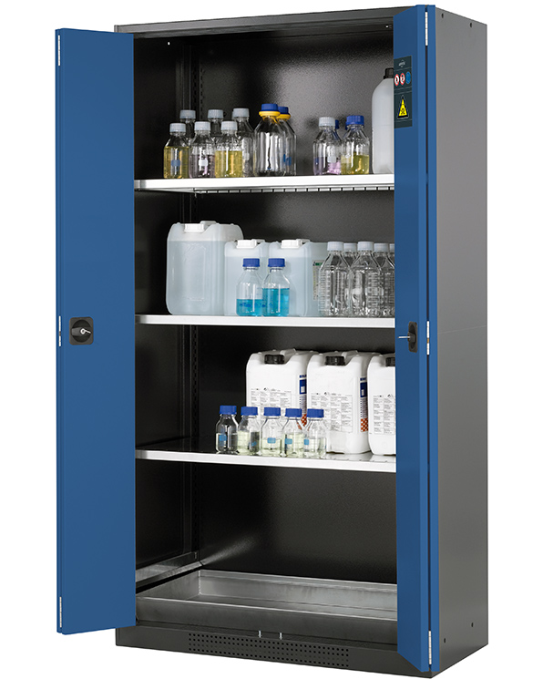 color del cuerpo gris antracita (RAL 7016), con puertas plegables en azul genciana (RAL 5010), equipamiento interior con 3 x bandeja, 1 x cubeto de retención (plancha de acero recubrimiento galvanizado)
