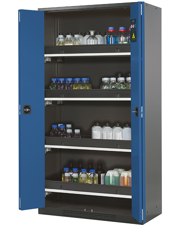color del cuerpo gris antracita (RAL 7016), con puertas plegables en azul genciana (RAL 5010), equipamiento interior con 4 x cajón extraíble (plancha de acero/PP recubrimiento plástico)