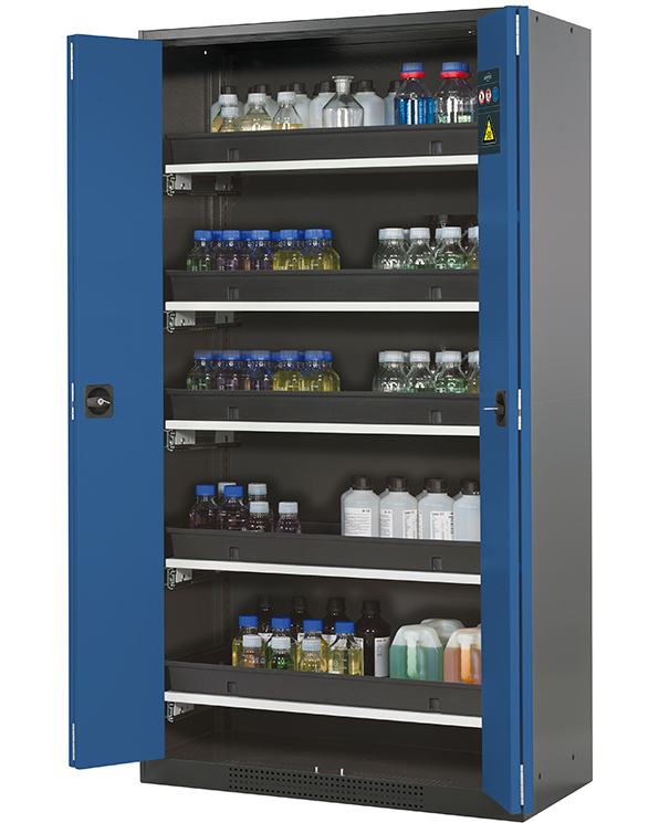 color del cuerpo gris antracita (RAL 7016), con puertas plegables en azul genciana (RAL 5010), equipamiento interior con 5 x cajón extraíble (plancha de acero/PP recubrimiento plástico)
