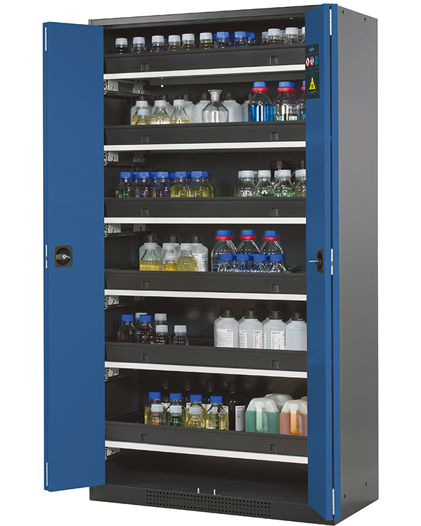 color del cuerpo gris antracita (RAL 7016), con puertas plegables en azul genciana (RAL 5010), equipamiento interior con 6 x cajón extraíble (plancha de acero/PP recubrimiento plástico)