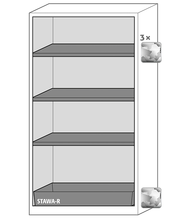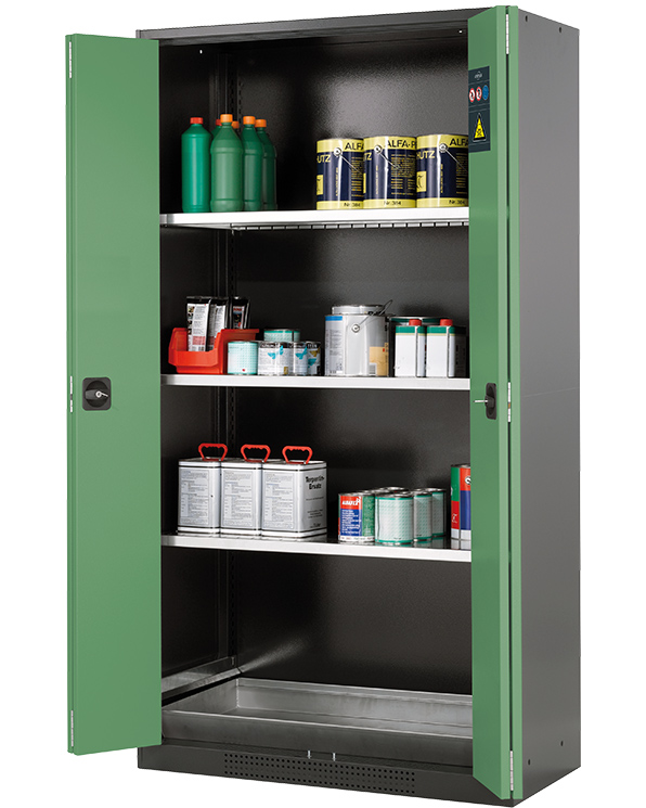 color del cuerpo gris antracita (RAL 7016), con puertas plegables en verde reseda (RAL 6011), equipamiento interior con 3 x bandeja, 1 x cubeto de retención (plancha de acero recubrimiento galvanizado)