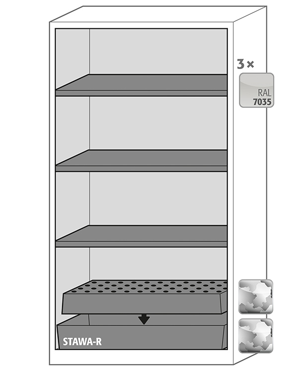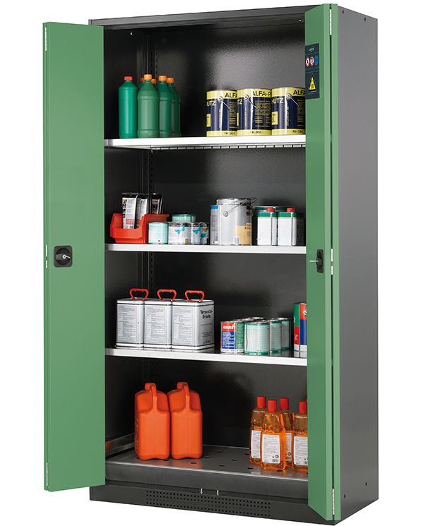 color del cuerpo gris antracita (RAL 7016), con puertas plegables en verde reseda (RAL 6011), equipamiento interior con 3 x bandeja, 1 x bandeja perforada, 1 x cubeto de retención (plancha de acero recubrimiento galvanizado)