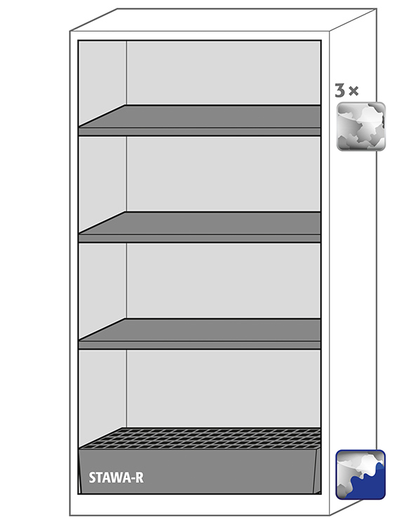 color del cuerpo gris antracita (RAL 7016), con puertas plegables en verde reseda (RAL 6011), equipamiento interior con 3 x bandeja, 1 x cubeto de retención con rejilla (plancha de acero recubrimiento galvanizado y lacado)