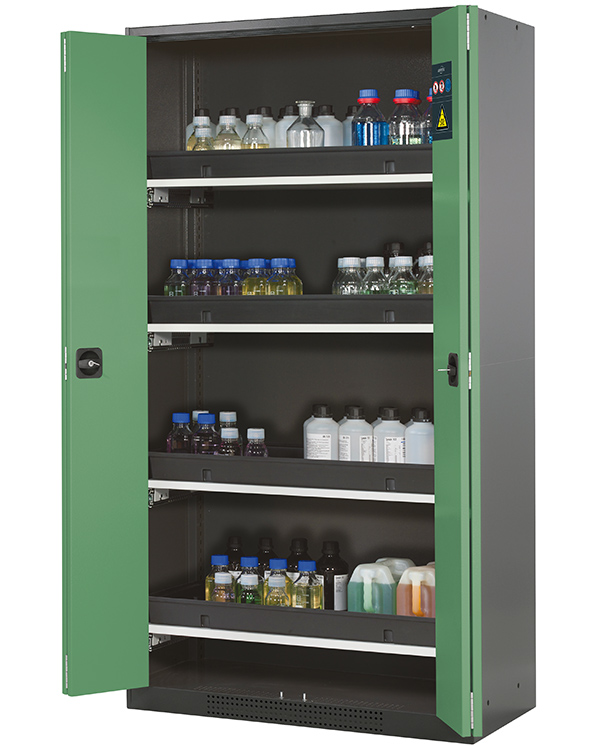 color del cuerpo gris antracita (RAL 7016), con puertas plegables en verde reseda (RAL 6011), equipamiento interior con 4 x cajón extraíble (plancha de acero/PP recubrimiento plástico)