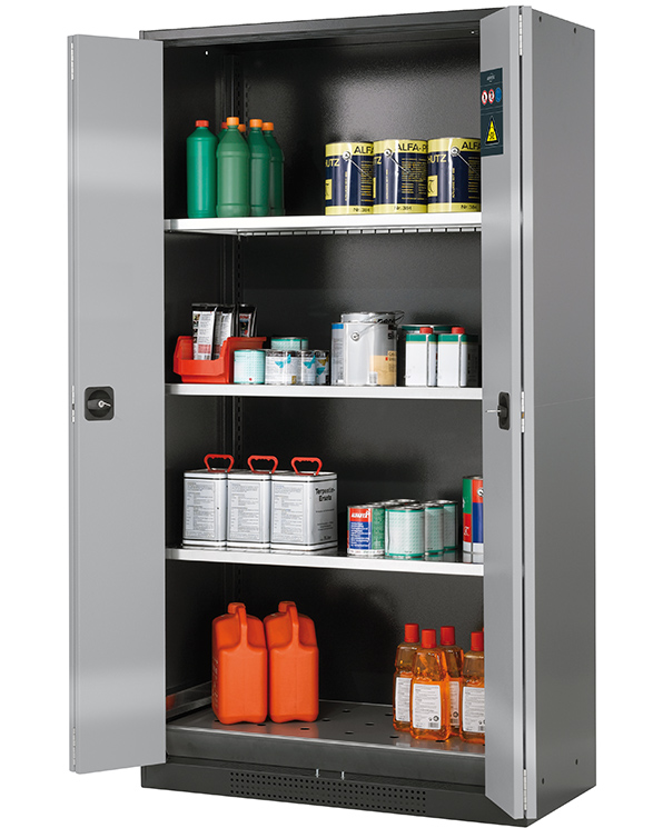 color del cuerpo gris antracita (RAL 7016), con puertas plegables en asecos plata, equipamiento interior con 3 x bandeja, 1 x bandeja perforada, 1 x cubeto de retención (plancha de acero recubrimiento galvanizado)