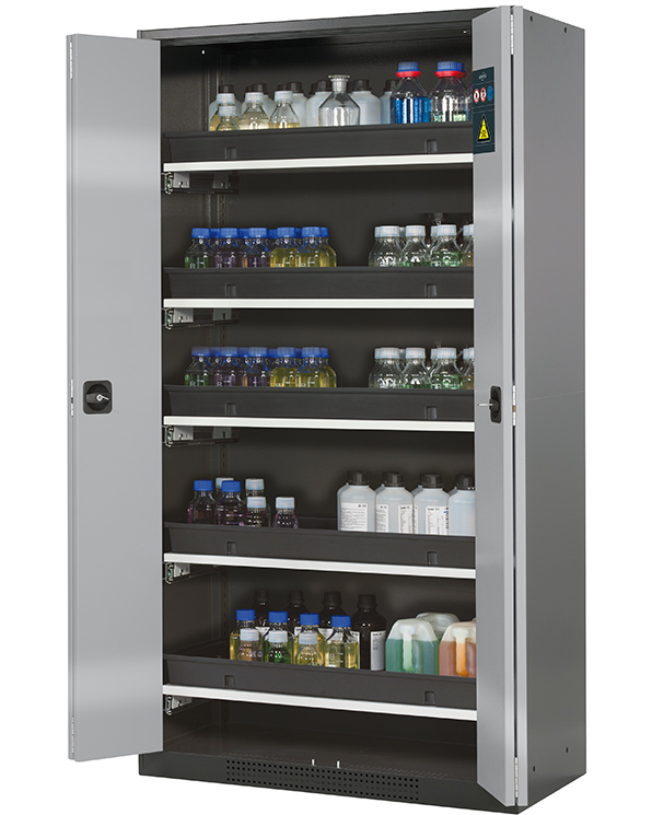 color del cuerpo gris antracita (RAL 7016), con puertas plegables en asecos plata, equipamiento interior con 5 x cajón extraíble (plancha de acero/PP recubrimiento plástico)