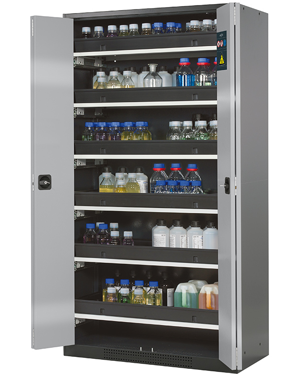 color del cuerpo gris antracita (RAL 7016), con puertas plegables en asecos plata, equipamiento interior con 6 x cajón extraíble (plancha de acero/PP recubrimiento plástico)