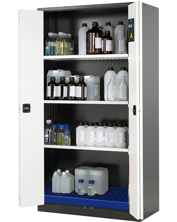 color del cuerpo gris antracita (RAL 7016), con puertas plegables en blanco puro (RAL 9010), equipamiento interior con 3 x bandeja, 1 x cubeto de retención con rejilla (plancha de acero recubrimiento galvanizado y lacado)
