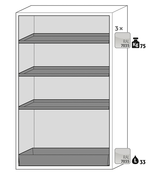 gris claro (RAL 7035), equipamiento interior con 3 x bandeja, 1 x cubeto de retención (plancha de acero recubrimiento plástico)