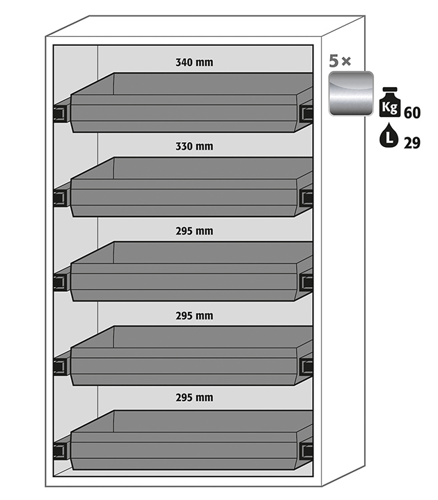 gris claro (RAL 7035), equipamiento interior con 5 x cajón extraíble (acero inox. 1.4301)