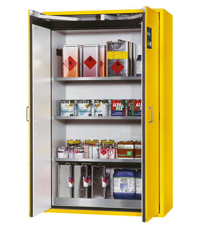 amarillo seguridad (RAL 1004), equipamiento interior con 3 x bandeja (acero inox. 1.4301), 1 x bandeja perforada (acero inoxidable 1.4016), 1 x cubeto de retención (acero inoxidable 14016)