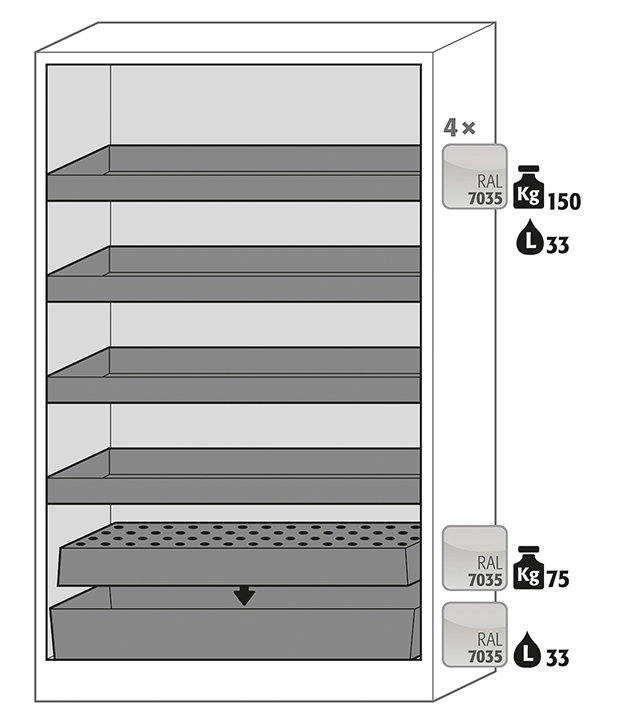 color del cuerpo gris antracita (RAL 7016), con puertas batientes en gris claro (RAL 7035), equipamiento interior con 4 x bandeja tipo cubeta, 1 x bandeja perforada, 1 x cubeto de retención (plancha de acero recubrimiento plástico)