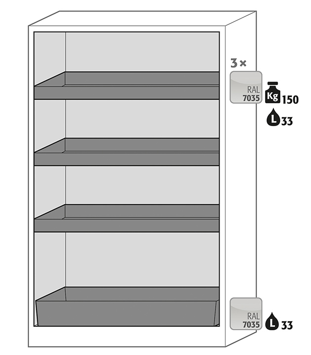 color del cuerpo gris antracita (RAL 7016), con puertas batientes en gris claro (RAL 7035), equipamiento interior con 3 x bandeja tipo cubeta, 1 x cubeto de retención (plancha de acero recubrimiento plástico)