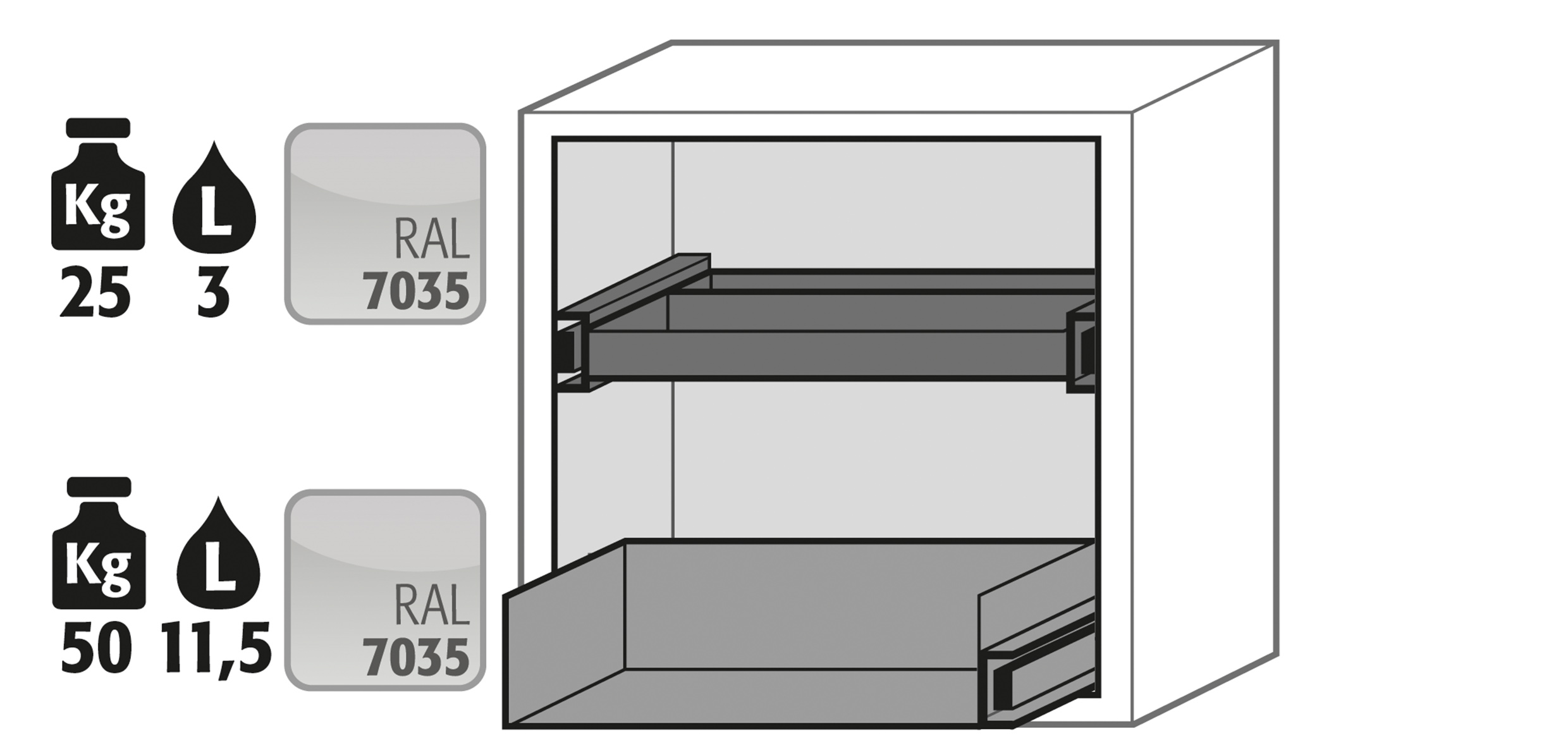 blanco laboratorio (sim. RAL 9016), equipamiento interior con 1 x cajón, 1 x cajón 2º nivel (plancha de acero recubrimiento plástico)