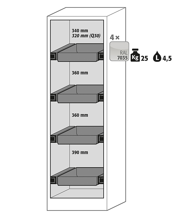 Rungon väri antrasiitinharmaa (RAL 7016), siipiovi vaaleanharmaa (RAL 7035), sisätilavarusteet 4 x vetolaatikko ( teräslevy jauhemaalattu)