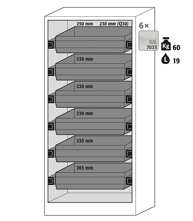 Rungon väri antrasiitinharmaa (RAL 7016), siipiovella (ovilla) vaaleanharmaa (RAL 7035), sisätilavarusteet 6 x vetolaatikko ( teräslevy jauhemaalattu)