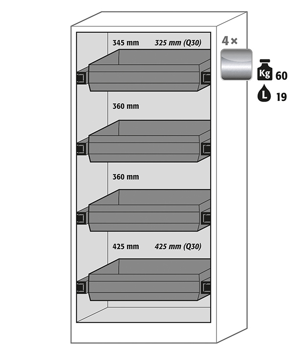 Rungon väri antrasiitinharmaa (RAL 7016), siipiovella (ovilla) vaaleanharmaa (RAL 7035), sisätilavarusteet 4 x vetolaatikko (Ruostumaton teräs 1.4301)