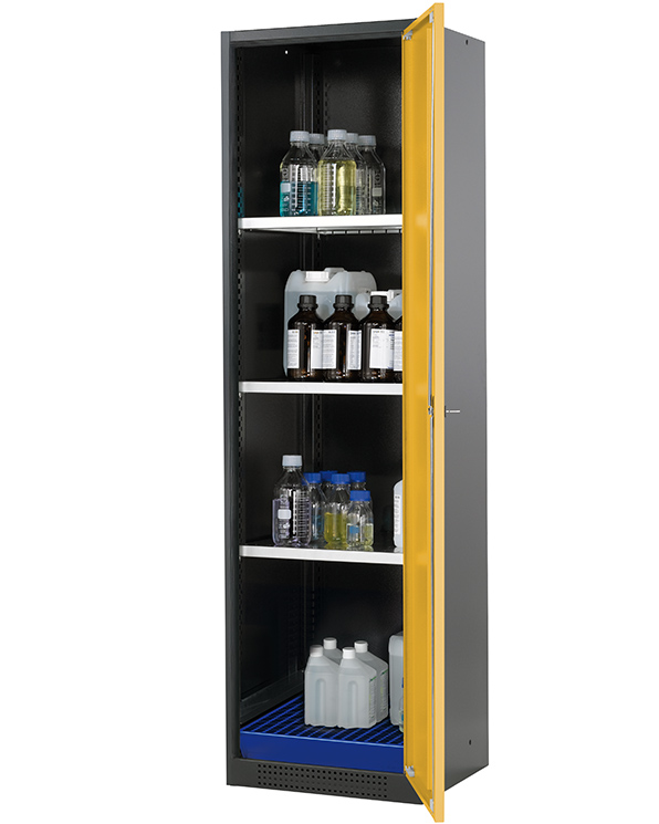 corps gris anthracite (RAL 7016), avec porte battante en jaune sécurité (RAL 1004), équipée avec 3 x étagère, 1 x bac de rétention au sol avec caillebotis (tôle d'acier galvanisé et laqué)