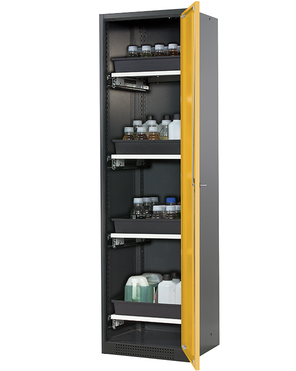 corps gris anthracite (RAL 7016), avec porte battante en jaune sécurité (RAL 1004), équipée avec 4 x étagère coulissante (tôle d'acier/polypropylène revêtement époxy)