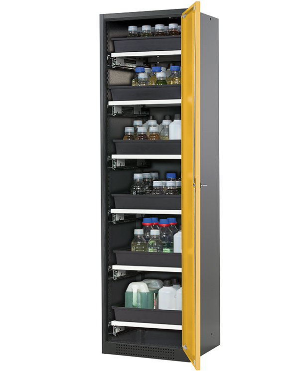 corps gris anthracite (RAL 7016), avec porte battante en jaune sécurité (RAL 1004), équipée avec 6 x étagère coulissante (tôle d'acier/polypropylène revêtement époxy)