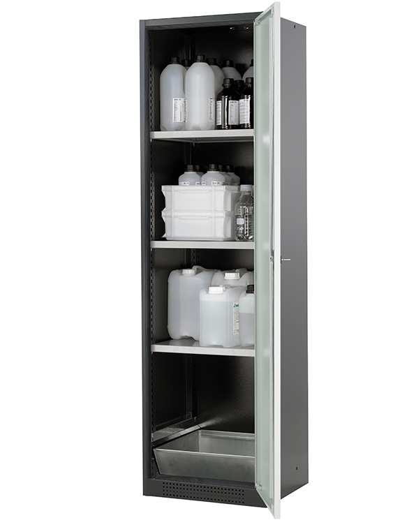 corps gris anthracite (RAL 7016), avec porte battante en gris clair (RAL 7035), équipée avec 3 x étagère, 1 x bac de rétention au sol (tôle d'acier galvanisé)
