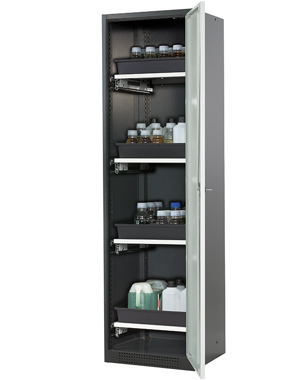 corps gris anthracite (RAL 7016), avec porte battante en gris clair (RAL 7035), équipée avec 4 x étagère coulissante (tôle d'acier/polypropylène revêtement époxy)