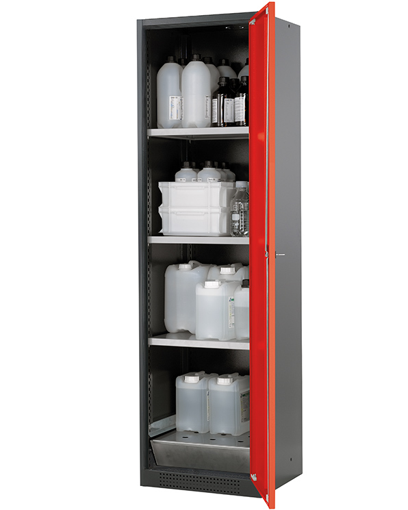 corps gris anthracite (RAL 7016), avec porte battante en rouge signalisation (RAL 3020), équipée avec 3 x étagère, 1 x caillebotis, 1 x bac de rétention au sol (tôle d'acier galvanisé)
