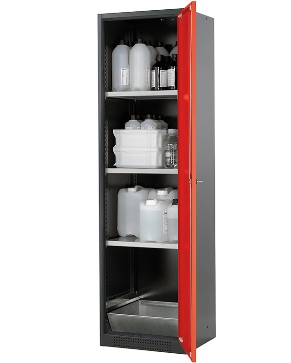 corps gris anthracite (RAL 7016), avec porte battante en rouge signalisation (RAL 3020), équipée avec 3 x étagère, 1 x bac de rétention au sol (tôle d'acier galvanisé)