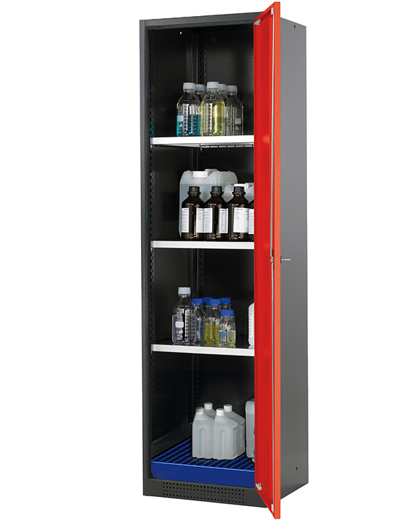 corps gris anthracite (RAL 7016), avec porte battante en rouge signalisation (RAL 3020), équipée avec 3 x étagère, 1 x bac de rétention au sol avec caillebotis (tôle d'acier galvanisé et laqué)