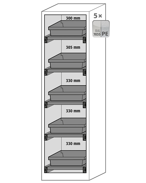 corps gris anthracite (RAL 7016), avec porte battante en bleu gentiane (RAL 5010), équipée avec 5 x étagère coulissante (tôle d'acier/polypropylène revêtement époxy)